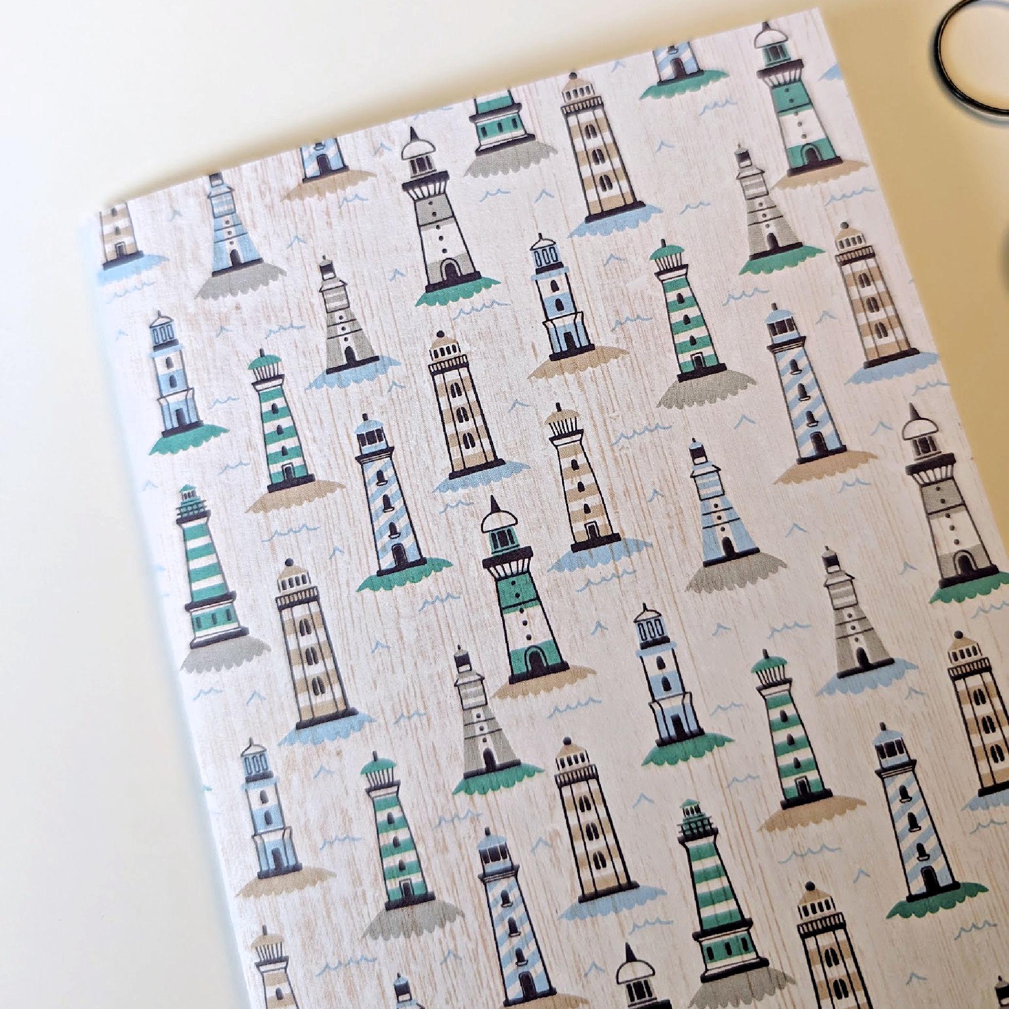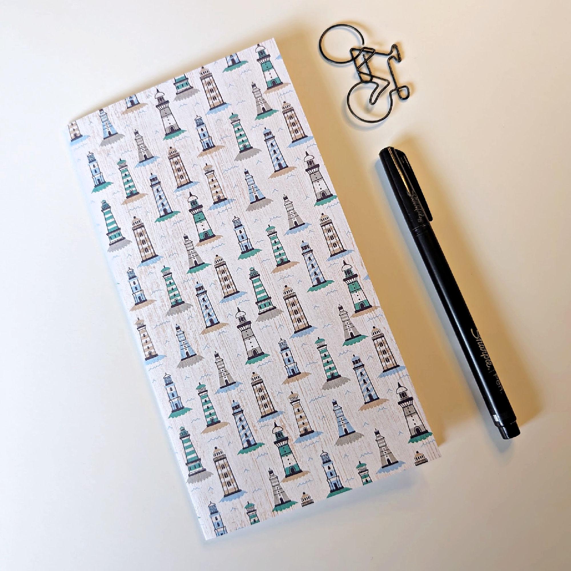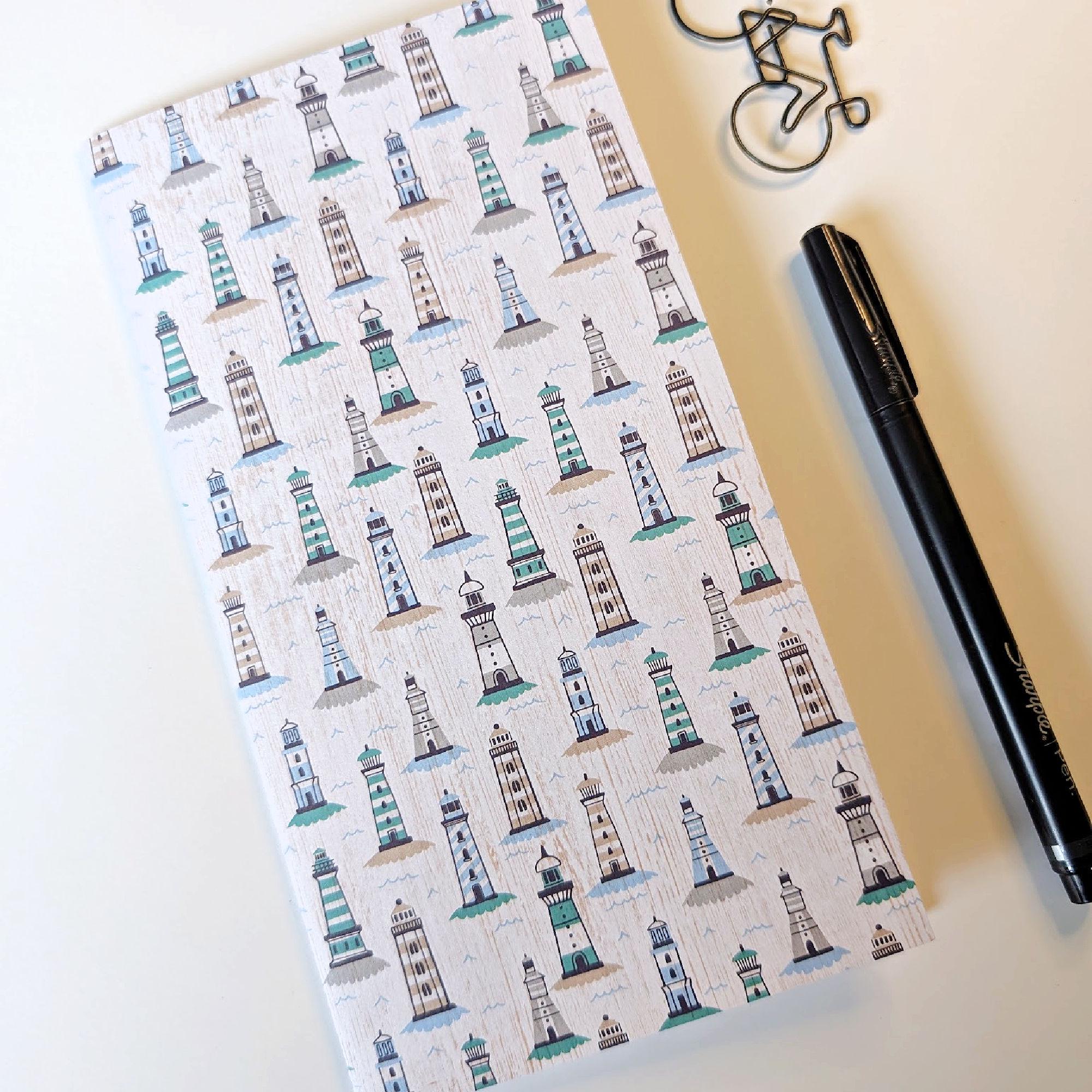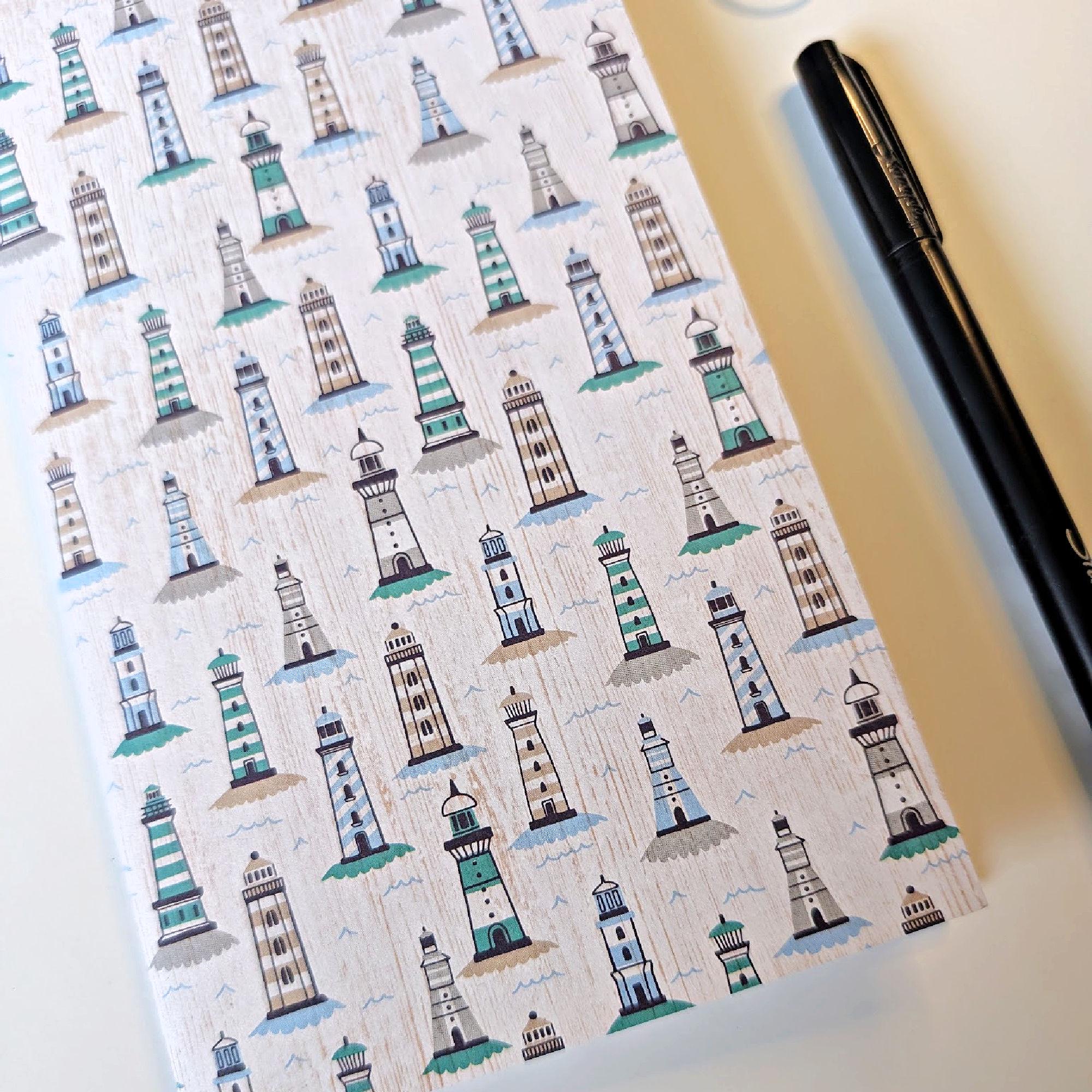 Blue and green light houses on this notebook insert refill