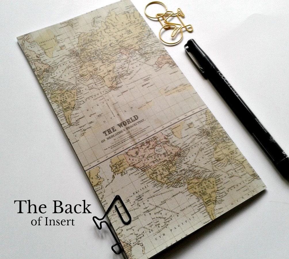 - Vintage style world map accents the cover of this insert